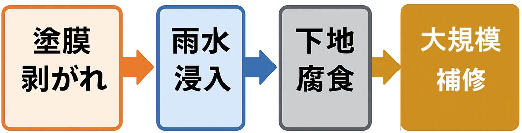 特に、塗膜が剥がれた状態のままにしてしまうと、雨水の浸入から下地の腐食へと進行し、最終的には大規模な補修が必要になることもあります。