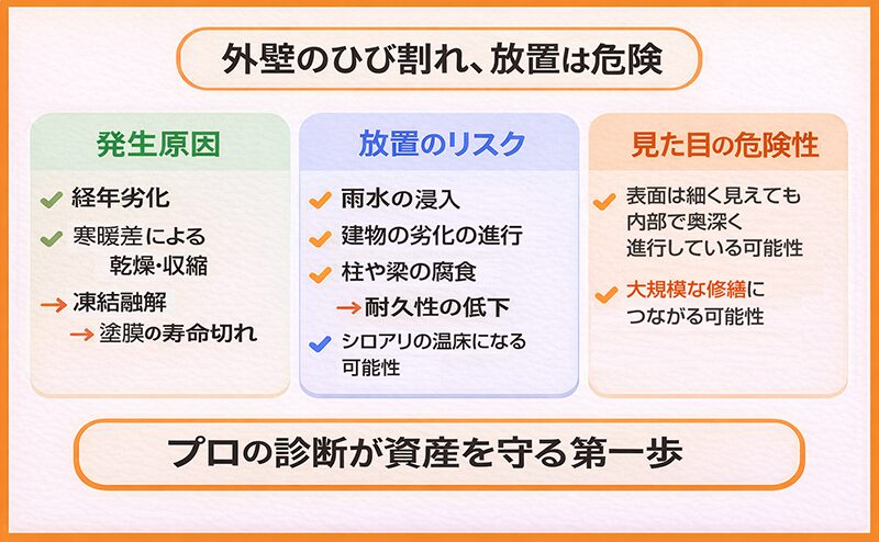つまり、小さなひび割れが、将来的に大規模な修繕につながる可能性があります。