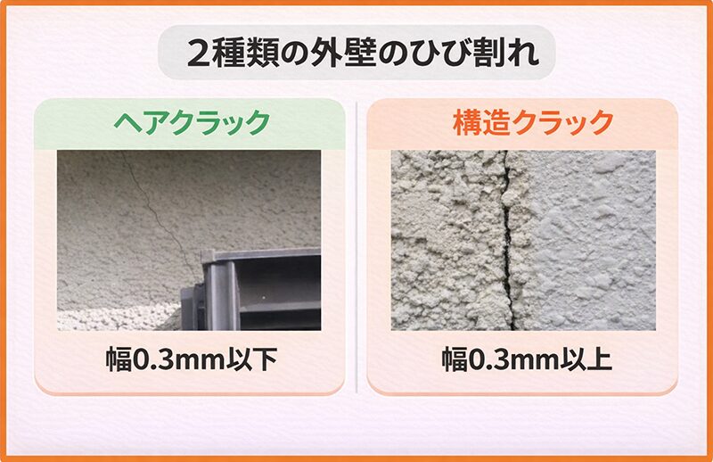 外壁のひび割れには、大きく分けてヘアクラックと構造クラックの2種類があります。