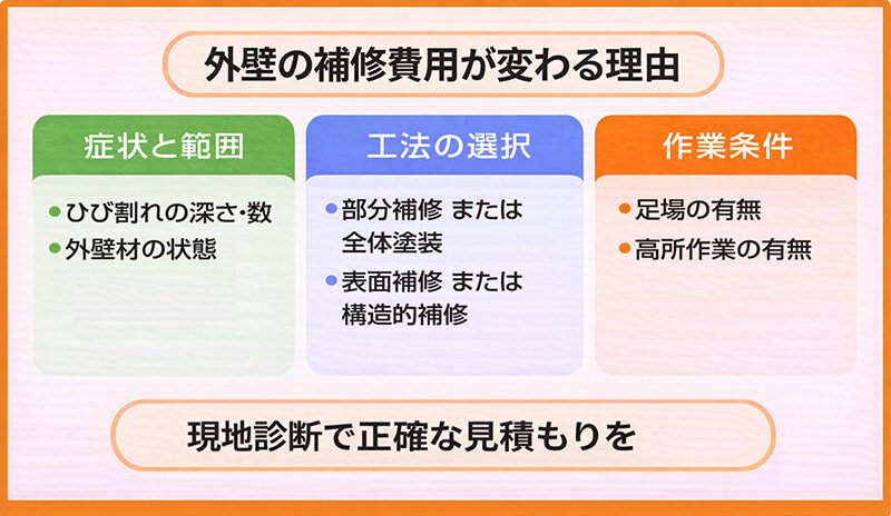 外壁修理の費用は、ひび割れの症状や範囲、そして採用する工法によって大きく変動します。