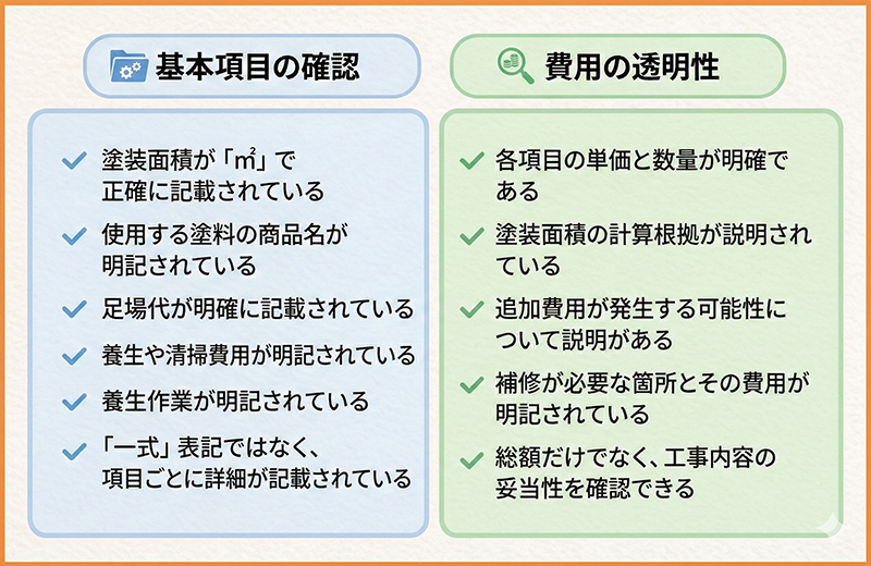 見積書は「一式」表記が多すぎないかを確認し、塗料の種類、塗装面積、下地処理などの工程の内容が具体的に書かれているかをチェックしましょう。また、工事後の品質の担保や追加費用の発生防止のためにも、保証内容(対象範囲・期間・免責)も重要です。