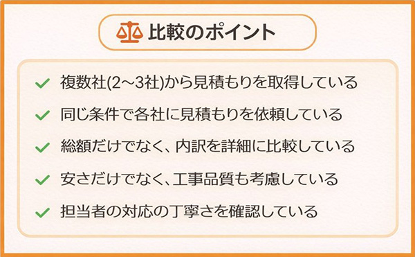 候補の会社を決めたら、必ず同じ条件で複数社から見積もりを取りましょう。この際、単に費用の総額を比べるのではなく、見積書の内訳や具体的な工事項目を丁寧に比較することが大切です。安さだけに偏って判断してしまうと、必要な工程が省かれるリスクもあるため注意してください。