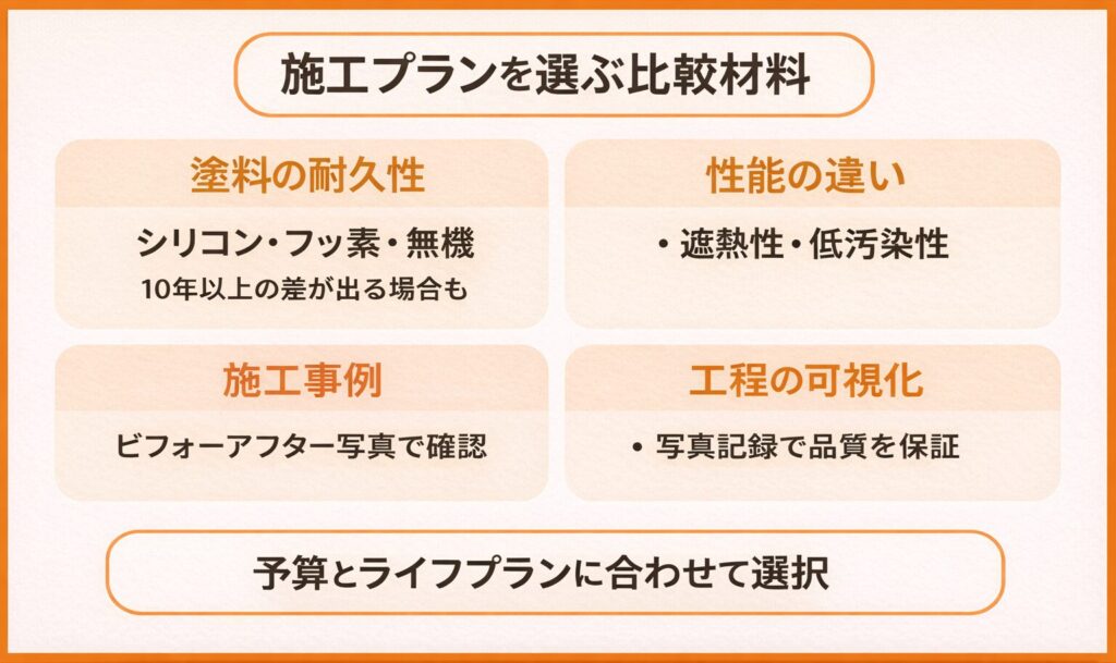 プロタイムズ亀岡店では、お客様の予算や将来のライフプランに合わせて複数のプランをご提案します。それぞれのプランが持つ遮熱性や低汚染性などの特徴を比較することで、より価値のある選択が可能になります。