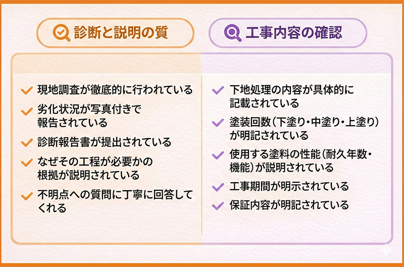 契約前の建物診断の丁寧さも大きなポイントです。建物の状態をビデオや写真で細かく記録し、分かりやすく説明してくれる業者を選んでください。